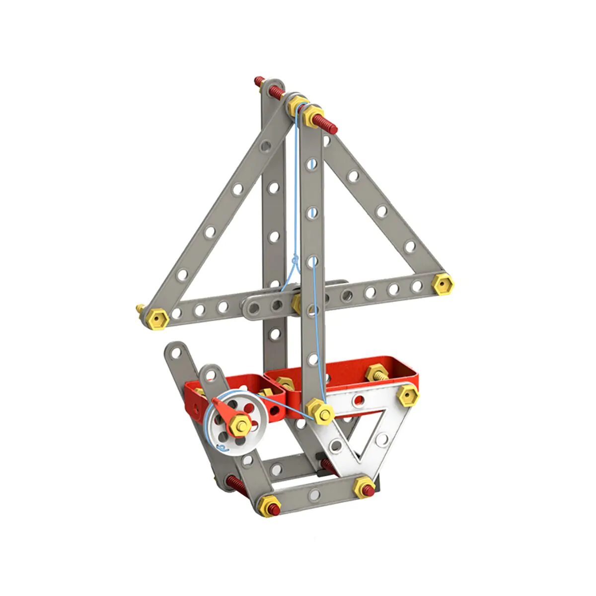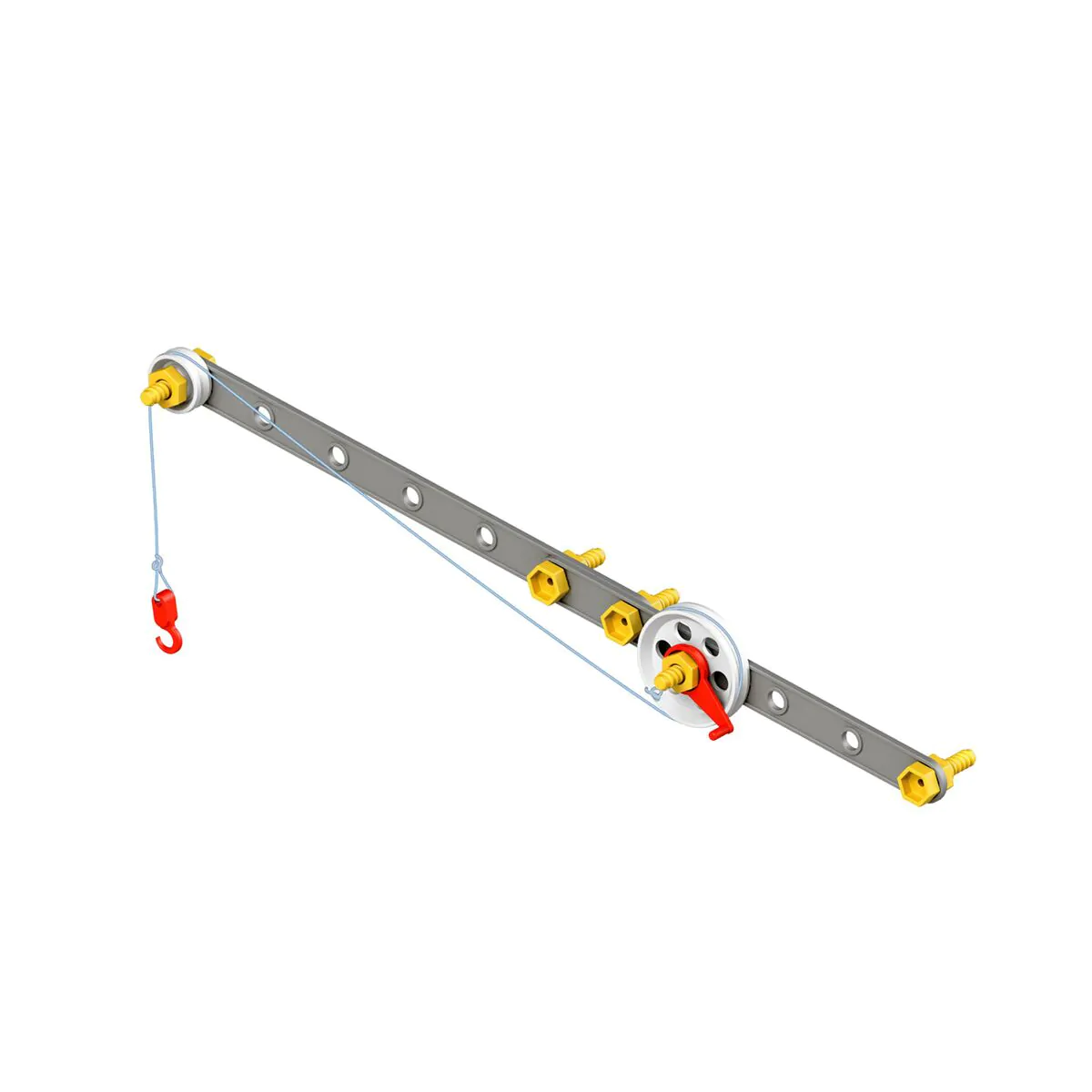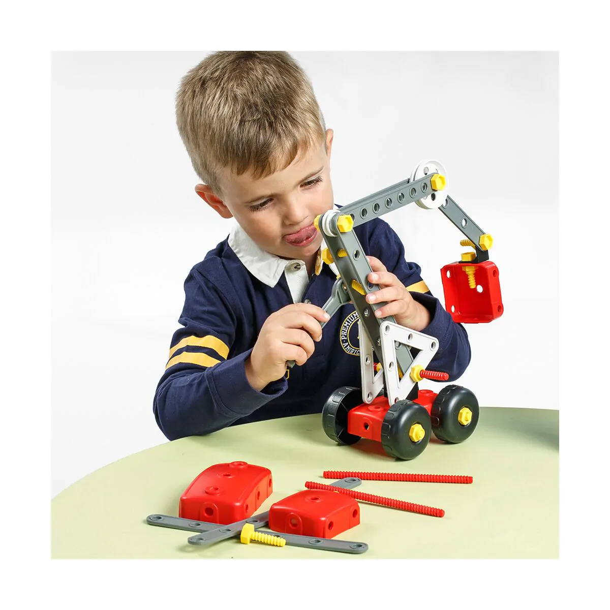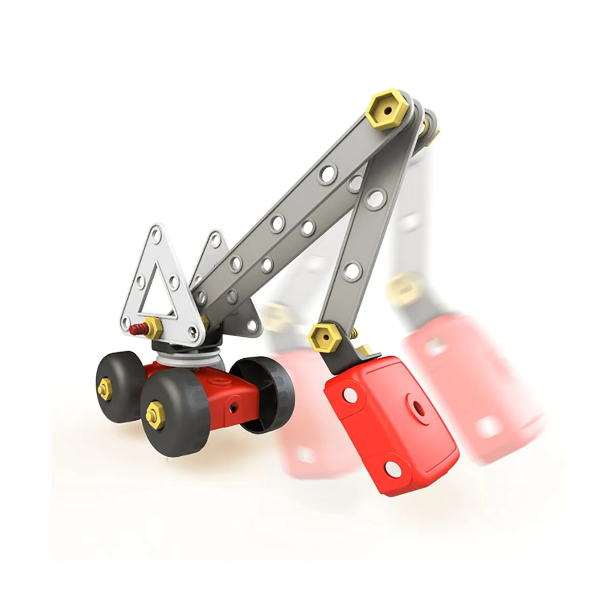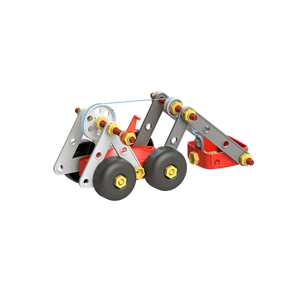 Mecaniko 81 presenta piezas de todo tipo y 6 fichas para construir objetos funcionales, y a partir de ahí realizar montajes más complejos desarrollando la creatividad.