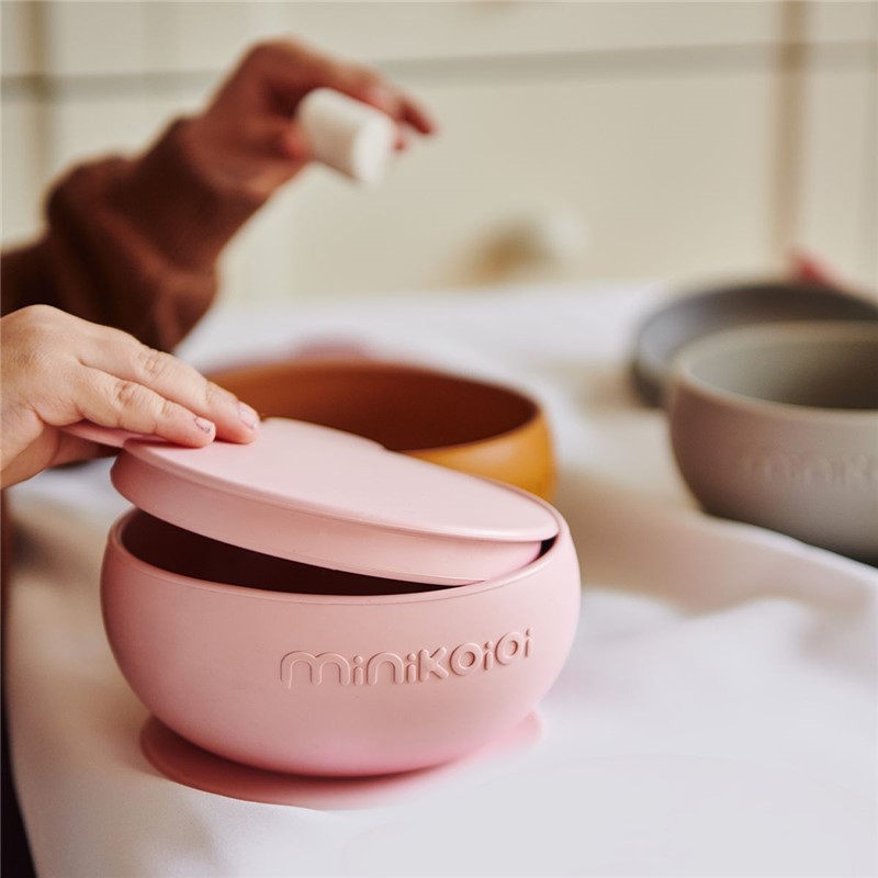 Bol de silicona con base de ventosa, que mantiene el recipiente de forma segura sobre la mesa. La tapa convierte el bol en un recipiente de almacenamiento. El bol es apto para horno y microondas hasta 200º C. Lavar a mano con agua tibia y jabón.