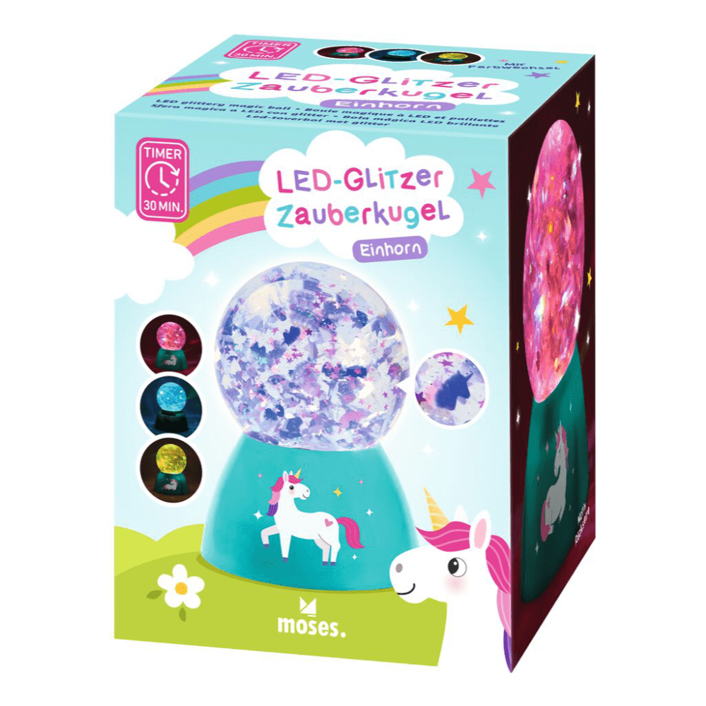 Una ipnotizante bola lámpara LED con confeti de estrellas y unicornios.