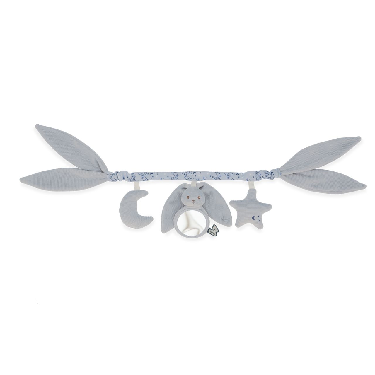 ¡Una cadena de actividades Lapinoo para paseos con bebé! Apto desde el nacimiento, es ideal para ofrecer juegos estimulantes a tu pequeño cuando está en su cochecito o en su acogedora habitación. El conejo es el centro de atención: de hecho, gracias a sus grandes orejas a cada lado se puede colgar el juguete de actividades para bebés. Cada juguete colgante ha sido diseñado para despertar los sentidos del bebé durante las salidas: una luna con papel que cruje, un pequeño conejo de peluche con un espejo para observarse y un sonajero de estrella para agitar.