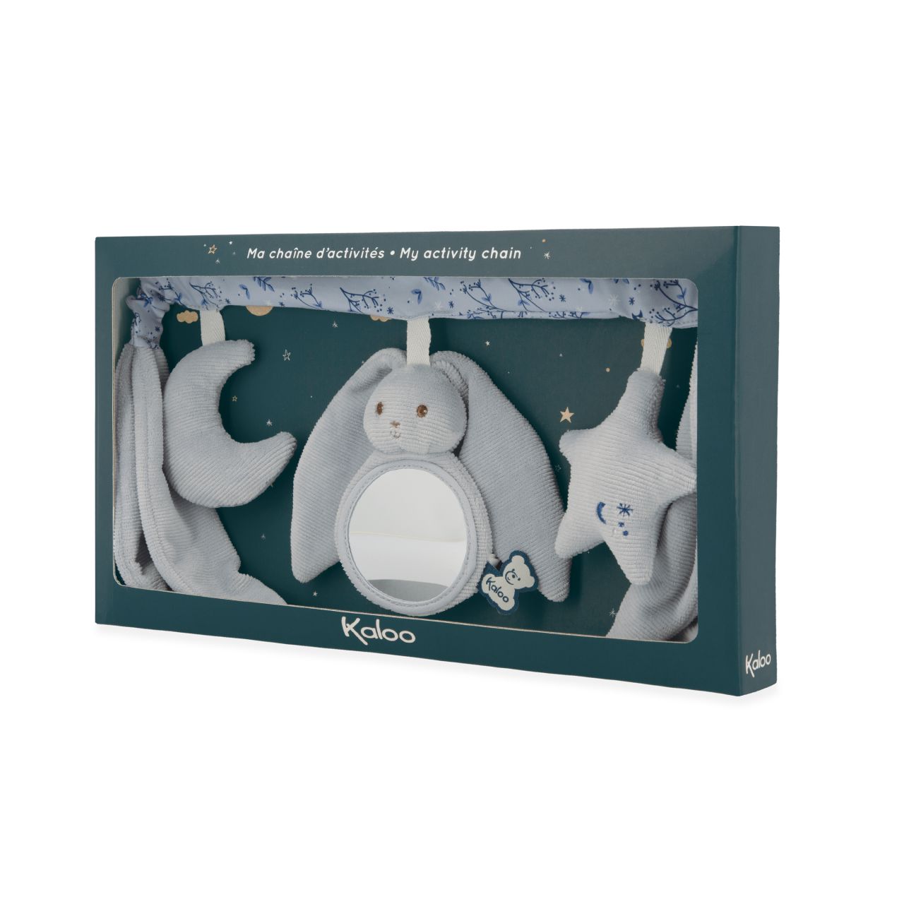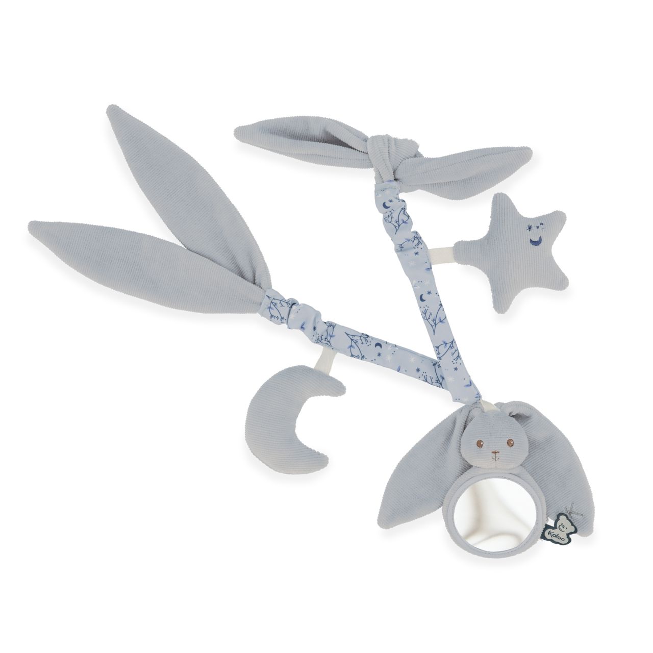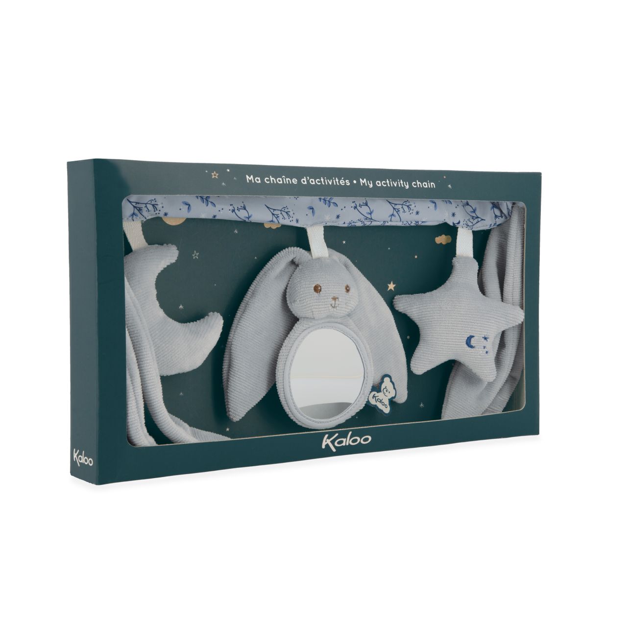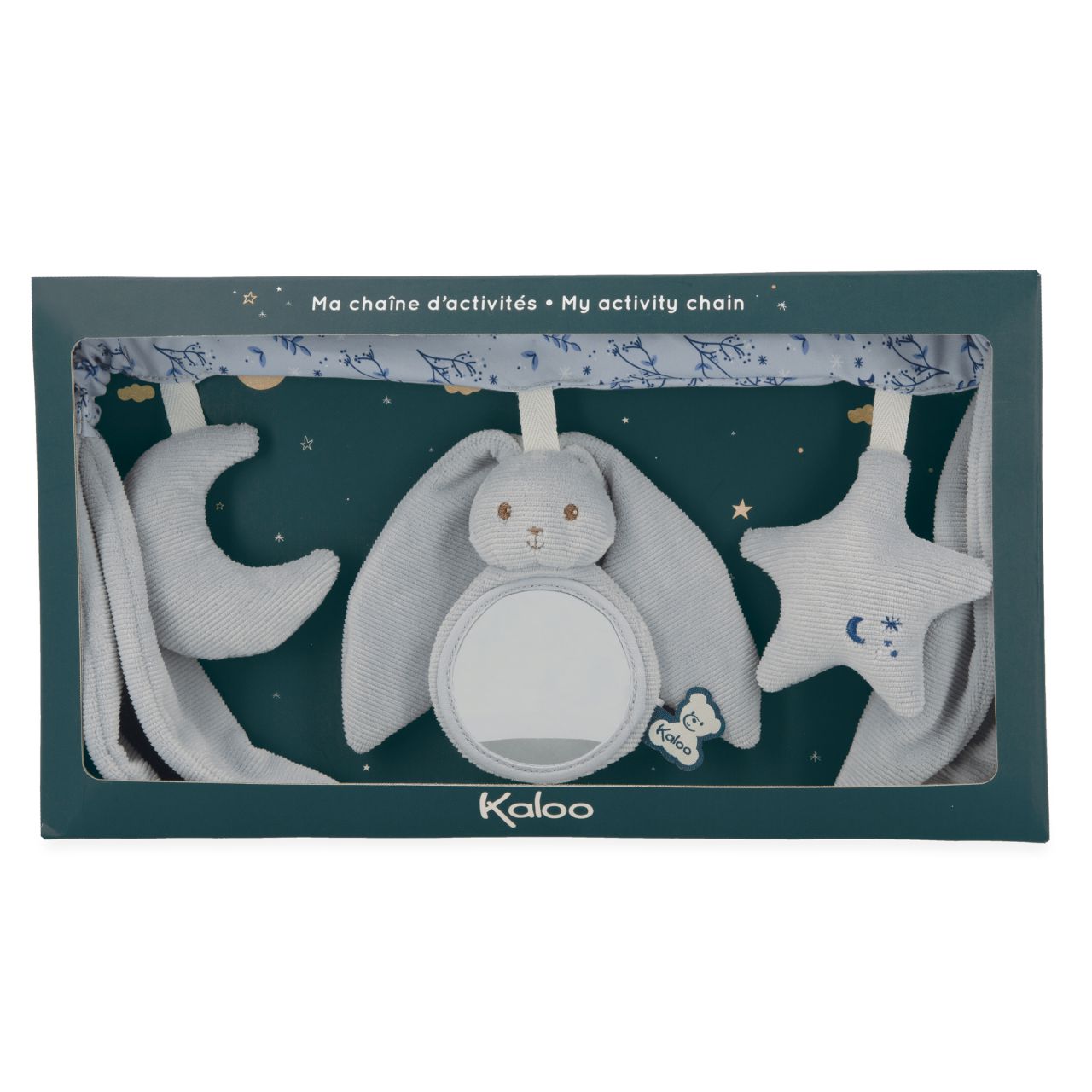 Sí, ¡las grandes orejas de nuestros Conejos Kaloo les permiten balancearse hacia el cielo! Fabricada con pana, popelina (poliéster) y acolchado de poliéster reciclado, esta cadena de actividades ayuda a desarrollar el tacto, la vista y el oído del bebé. Práctico y extrasuave, es el accesorio de cochecito que acompaña al bebé en todos sus viajes. ¡Con motivo del nacimiento, siempre es una buena idea ofrecer un juguete de actividad que favorezca el desarrollo sensorial del bebé! Este juguete portátil mide 40 cm de largo y es totalmente lavable a máquina a 30°.