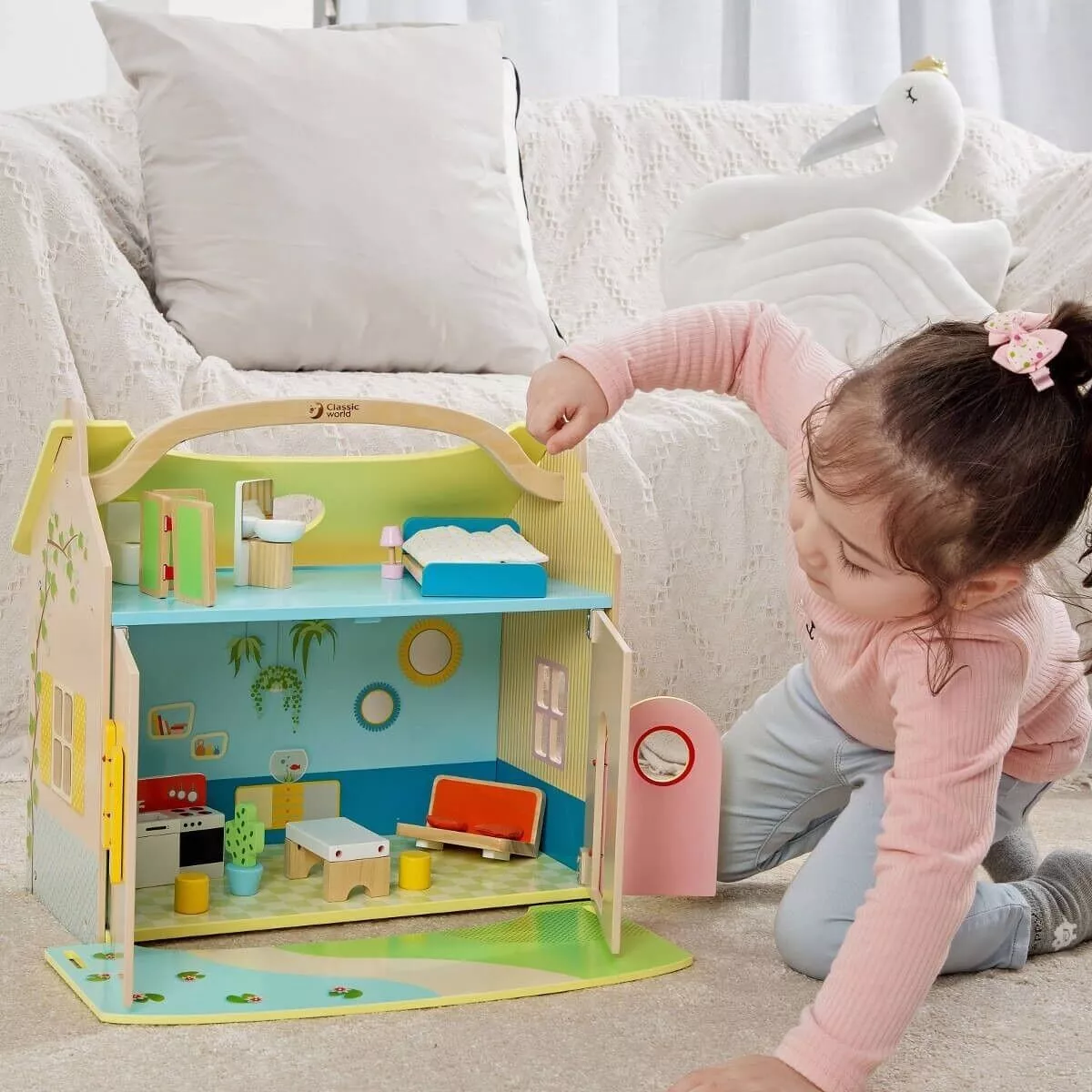 ¡Qué bonita casa de ensueño! Abre su puerta, coloca el techo como patio delantero y ¡a jugar!.