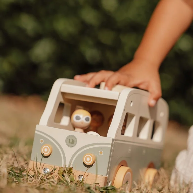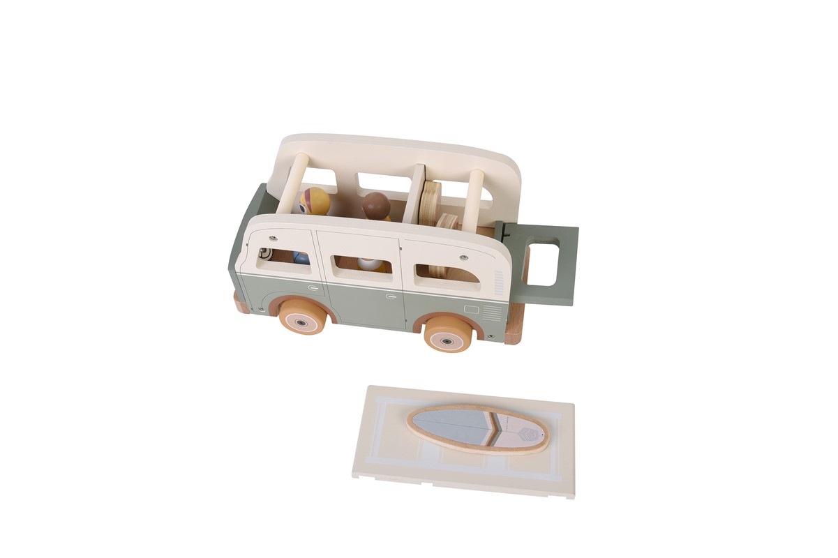 ¡Vamos a dar un paseo juntos! Levanta el techo de tu furgoneta retro y coloca los muñecos encajables en su interior, viaja por el mundo inventando mil historias.