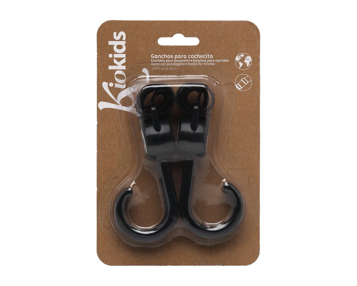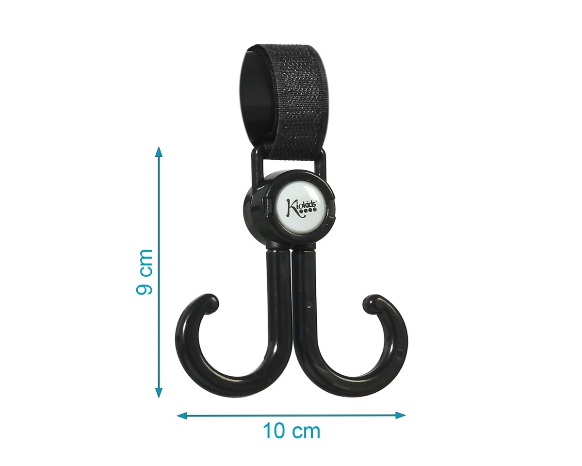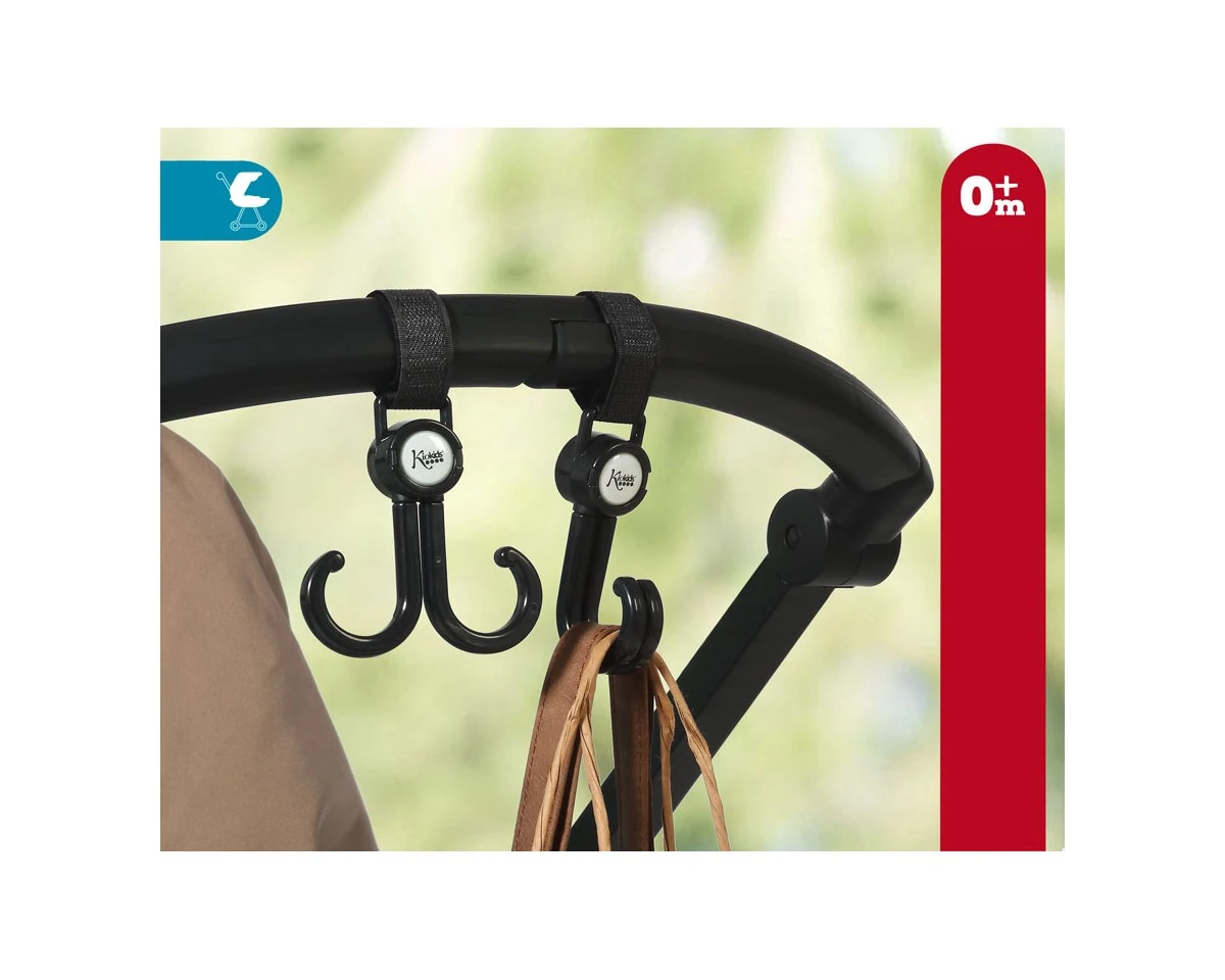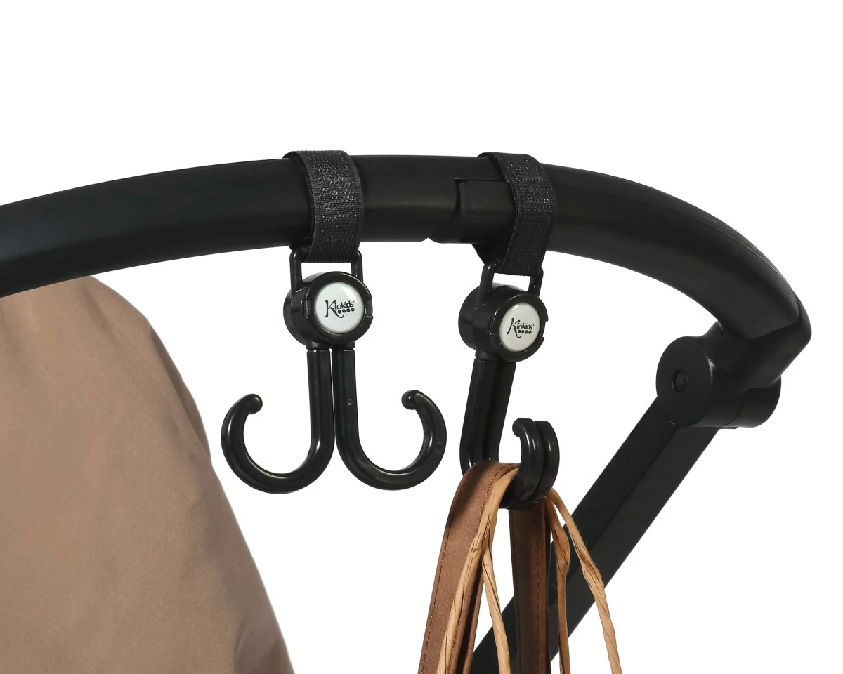 Prácticos y resistentes ganchos dobles con rotación de 360º, diseñados para colgar bolsas, mochilas u otros accesorios en el carrito del bebé. Se fijan fácilmente al manillar de cualquier cochecito o sillita gracias a su sistema de velcro ajustable, compatible con distintos grosores.