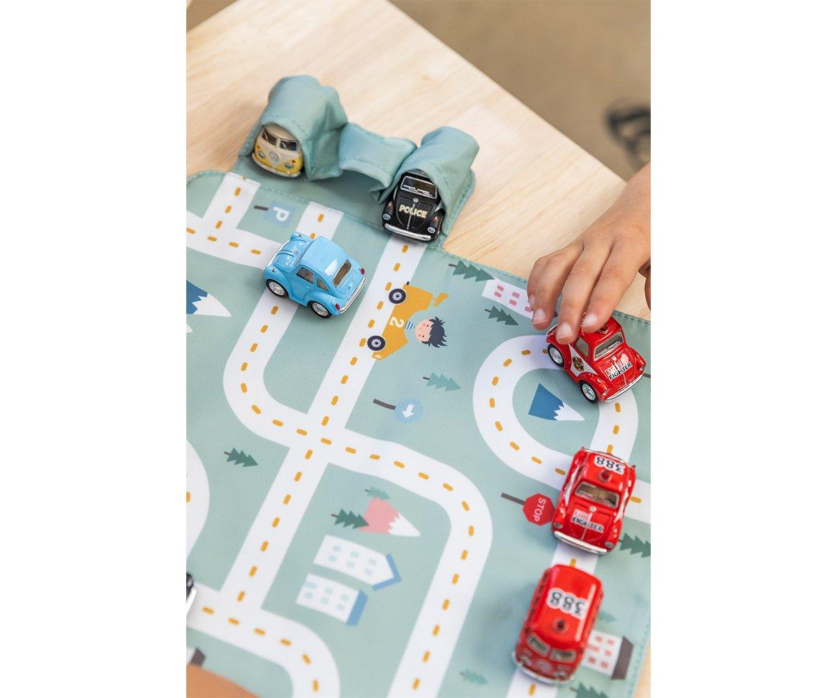 Mantelito de mesa con el dibujo de un circuito para poder jugar con coches o incluso llevarlo en el bolso cuando se sale a comer fuera de casa o de viaje y que el niño esté divertido.