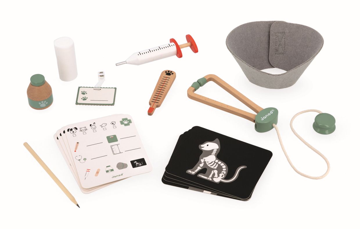 Este maletín de juego contiene 16 accesorios, 4 de ellos de madera: 1 credencial profesional, 4 tarjetas para recetas, 4 radiografías (gato, conejo, pez y primer plano de un hueso), 1 lápiz, 1 vendaje, 1 collar de fieltro, 1 estetoscopio, 1 jeringa, 1 termómetro y 1 frasco de ungüento.