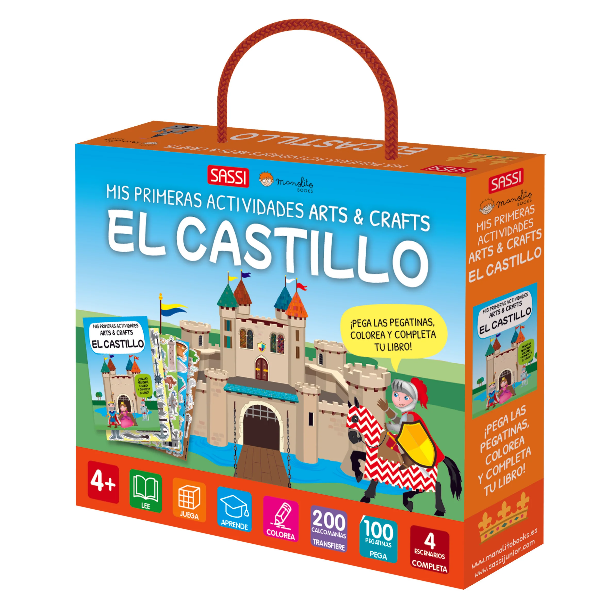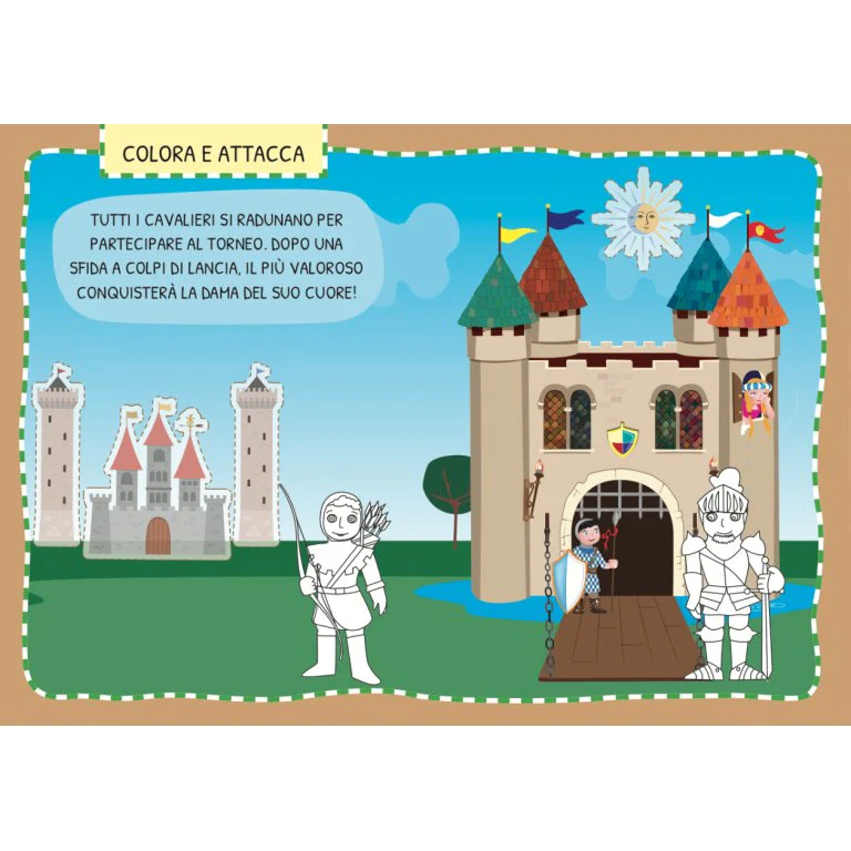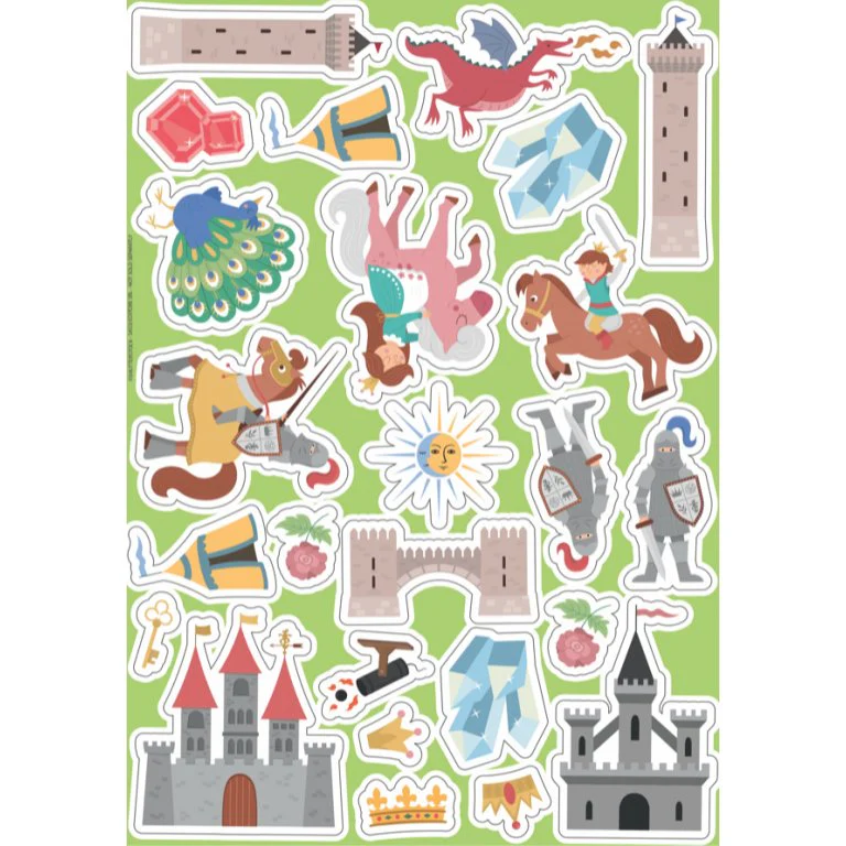 Lea el libro de 16 páginas y diviértase con las actividades propuestas. 100 pegatinas, 200 transferibles y un palito especial para completar y colorear con imaginación los 4 escenarios del castillo medieval.