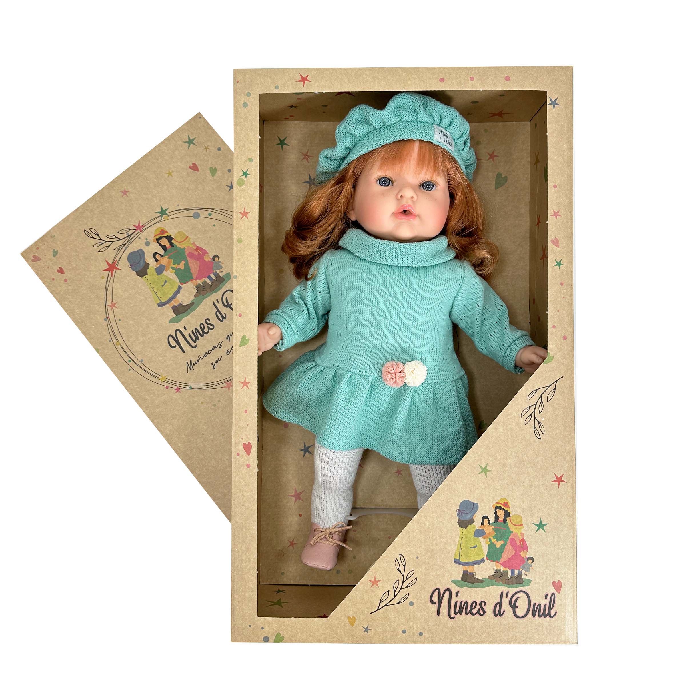 TITA LANA es una muñeca que mide 45cm. Tiene las extremidades de vinilo y el cuerpo blandito elaborado con tejido hipoalergénico. En este caso, vestida con leotardos, un bonito vestido en punto con su boina a juego.