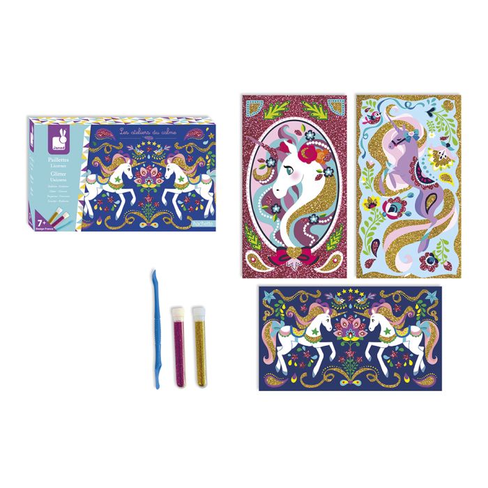 Una entretenida y bonita manualidad que encentará a todos los fans de los unicornios. Compuesto por 3 escenas adhesivas para decorar, 2 tubos de purpurina, 1 espátula y 1 manual con modelos y instrucciones.