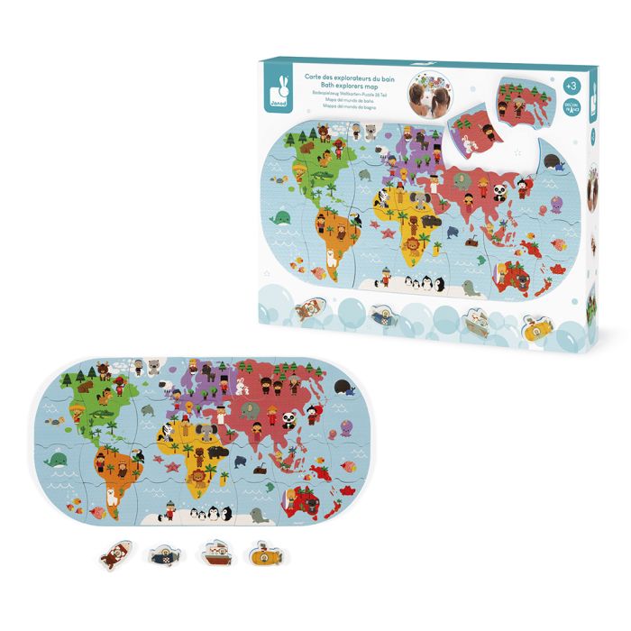 Mi primer mapa del mundo para jugar y aprender durante el baño. Diviértete recorriendo el mundo gracias a las 4 piezas de vehículos adicionales. ¡Son mágicas! Sumerge las piezas en el agua, ¡flotan y se quedan sujetas en los azulejos!