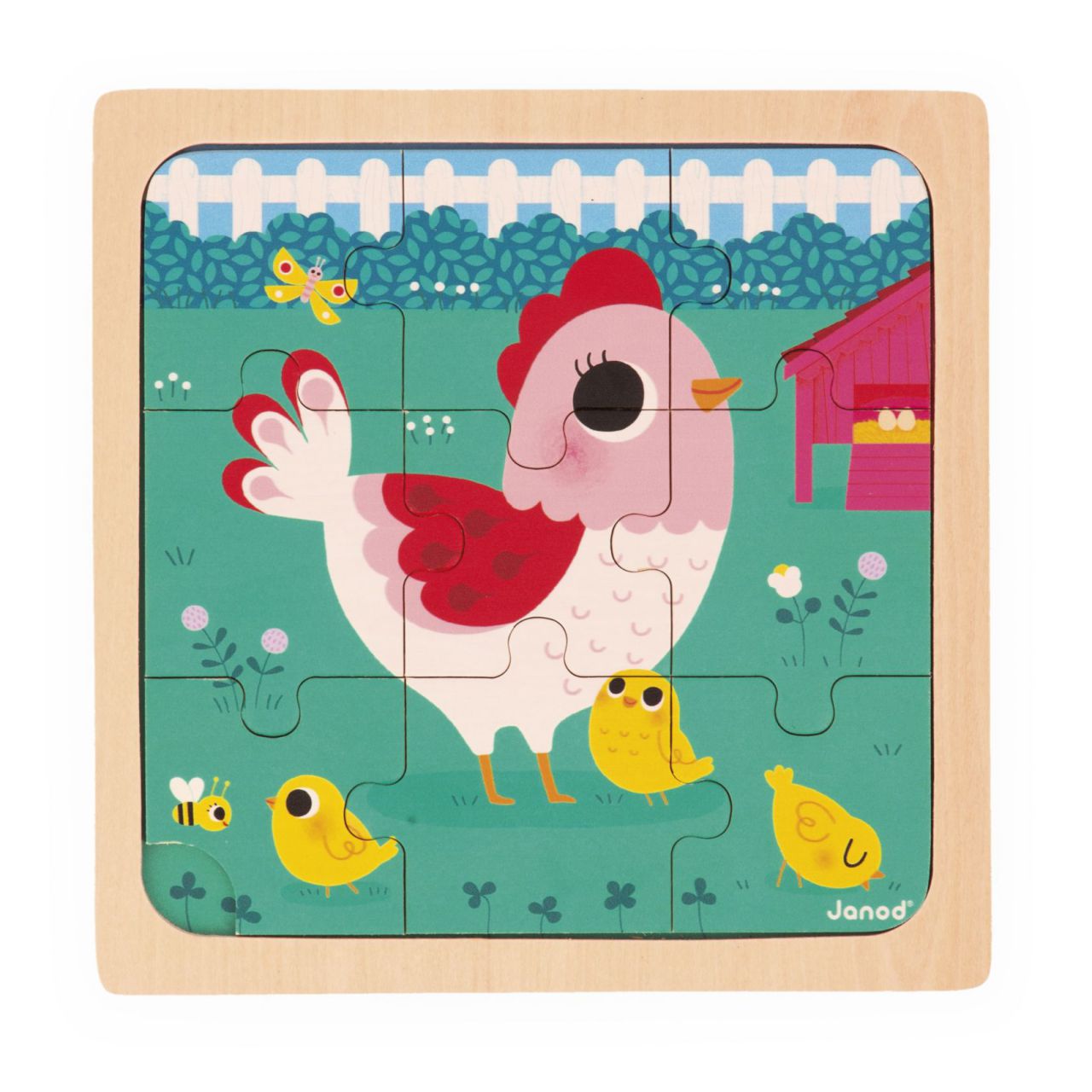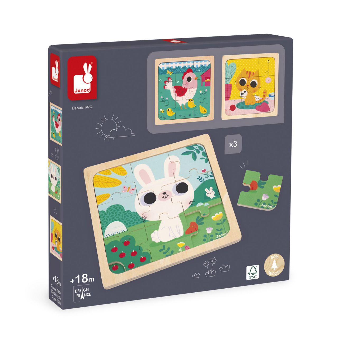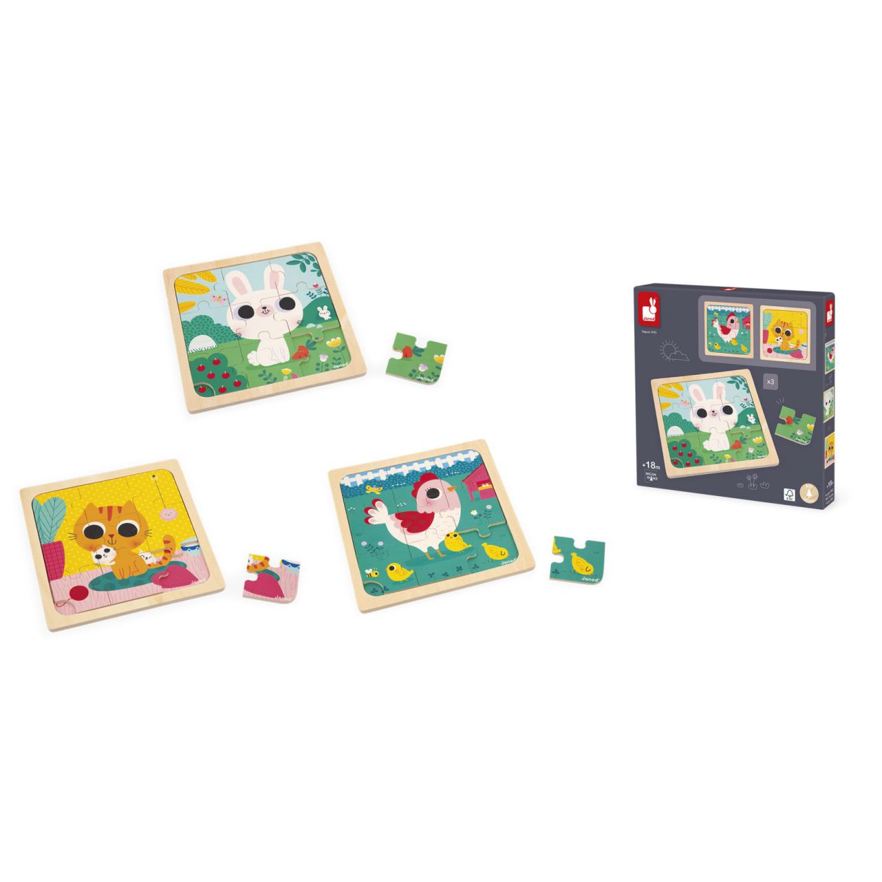 ¡Descubra a Henriette, Peanut y el conejo blanco en una misma caja! Una caja con tres puzles que incluyen al gatito Peanut, el conejo blanco roedor de zanahorias y la coqueta gallinita Henriette.