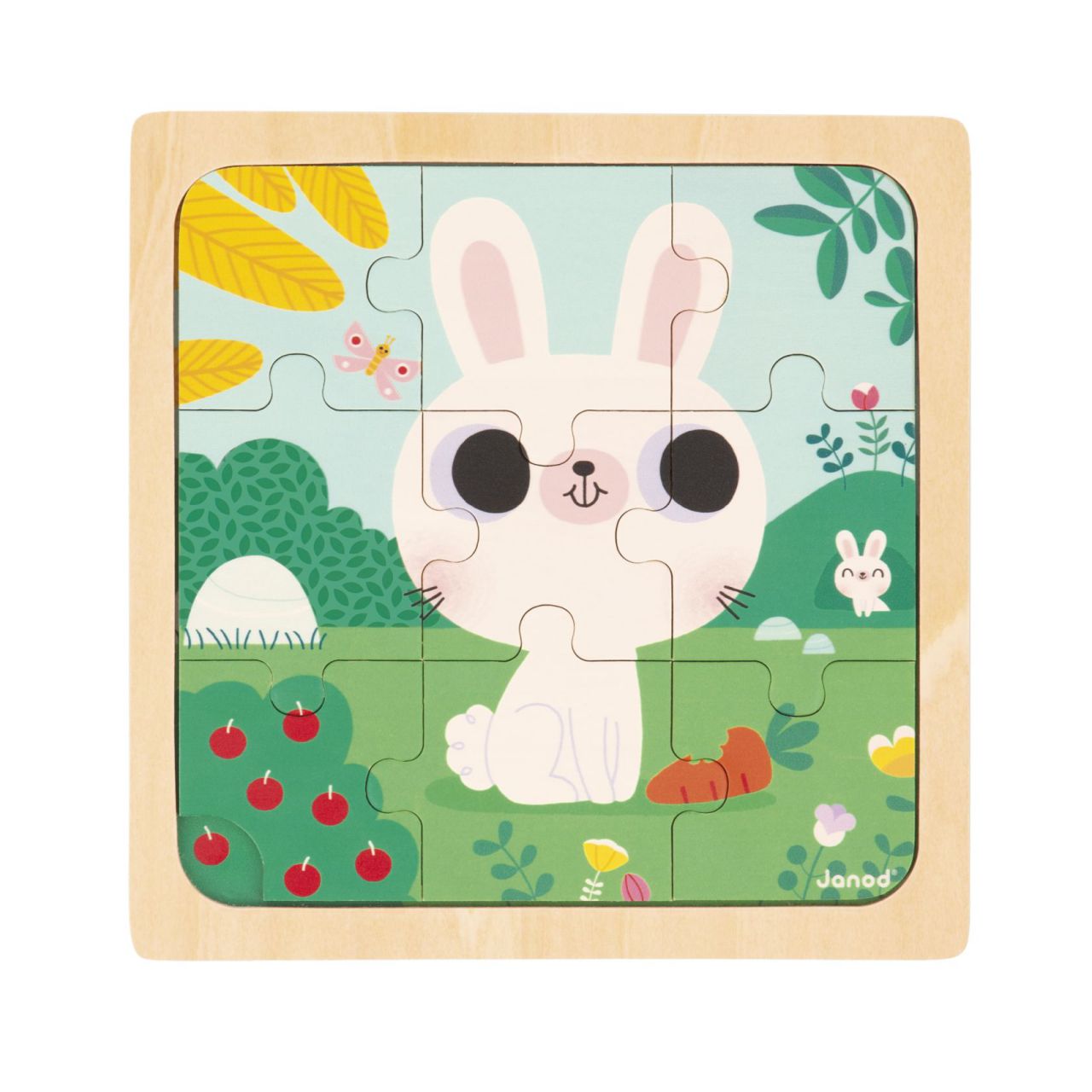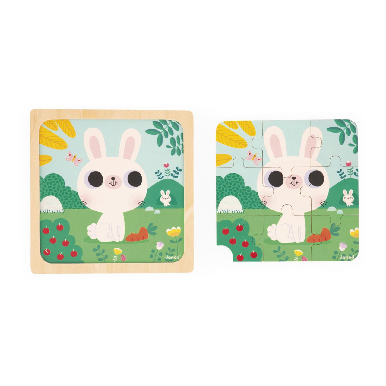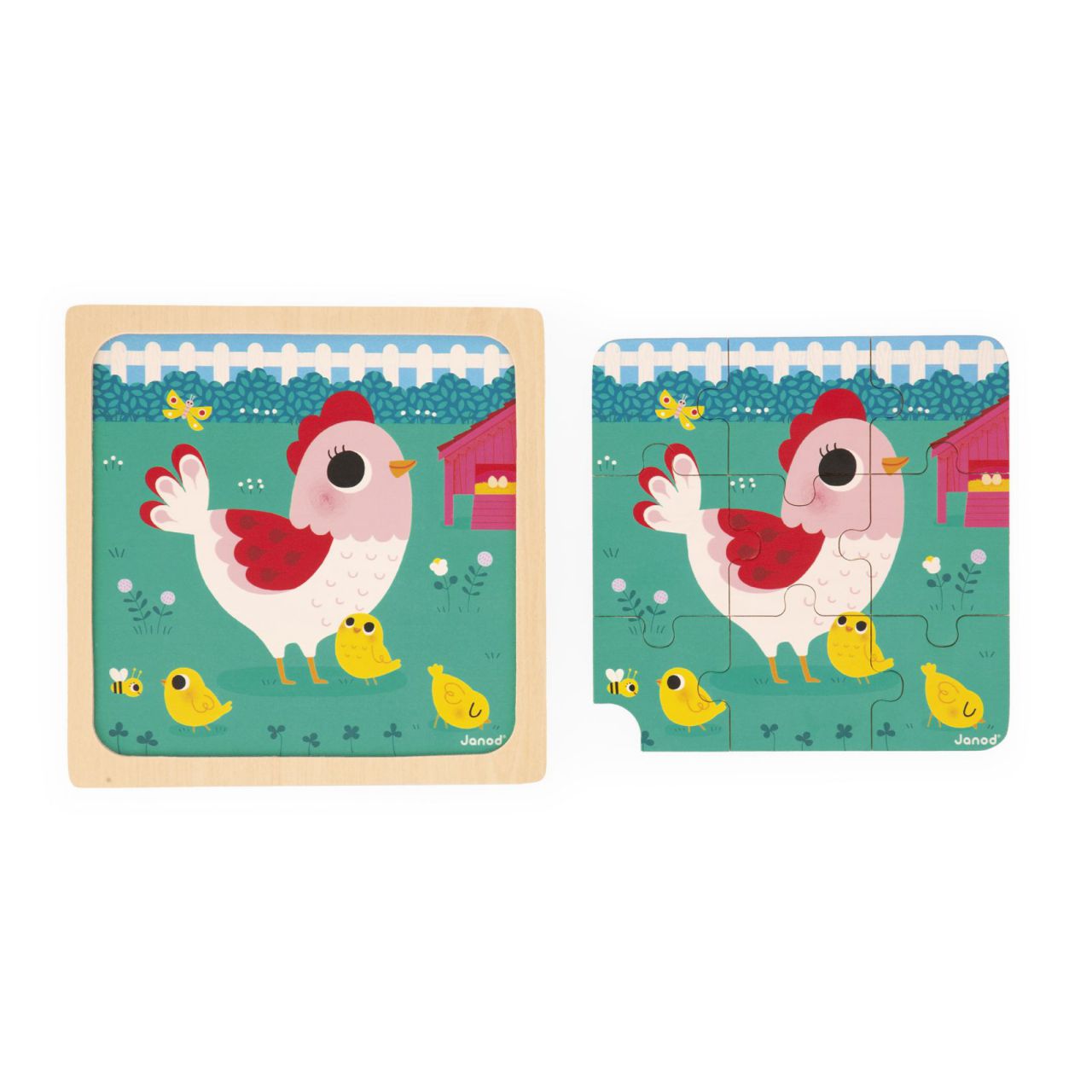 ¡Descubra a Henriette, Peanut y el conejo blanco en una misma caja! Una caja con tres puzles que incluyen al gatito Peanut, el conejo blanco roedor de zanahorias y la coqueta gallinita Henriette.