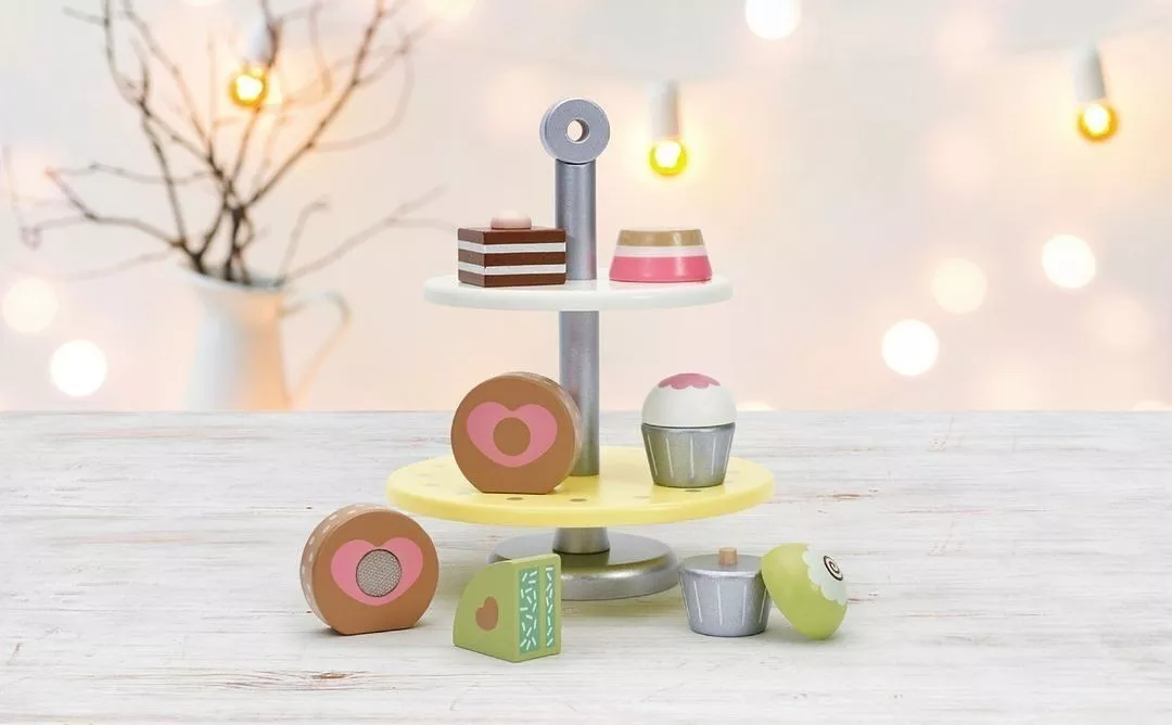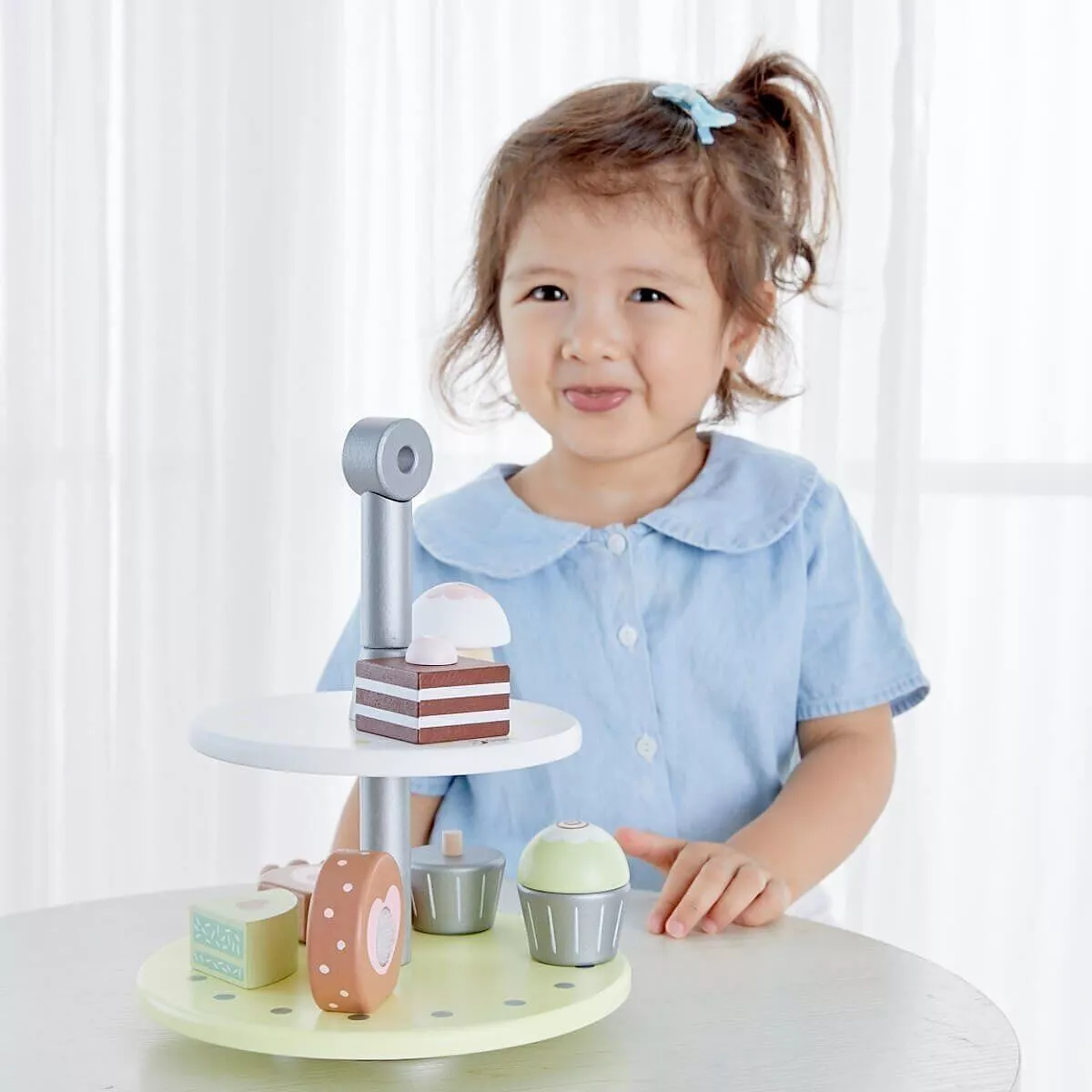 El set de cupcakes de madera, es un bonito soporte para cupcakes que incluye 6 pasteles de madera y golosinas con partes superiores e inferiores intercambiables, ¡Haz tus propias combinaciones! Promueve la imaginación y fomenta el juego imitativo e imaginario.