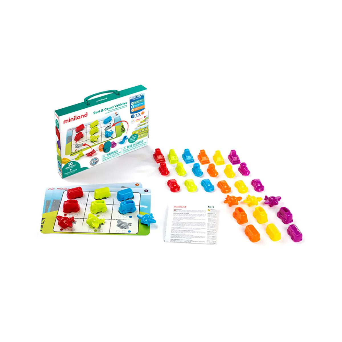1 guía didáctica, 36 vehículos y 5 fichas de actividad a doble cara.