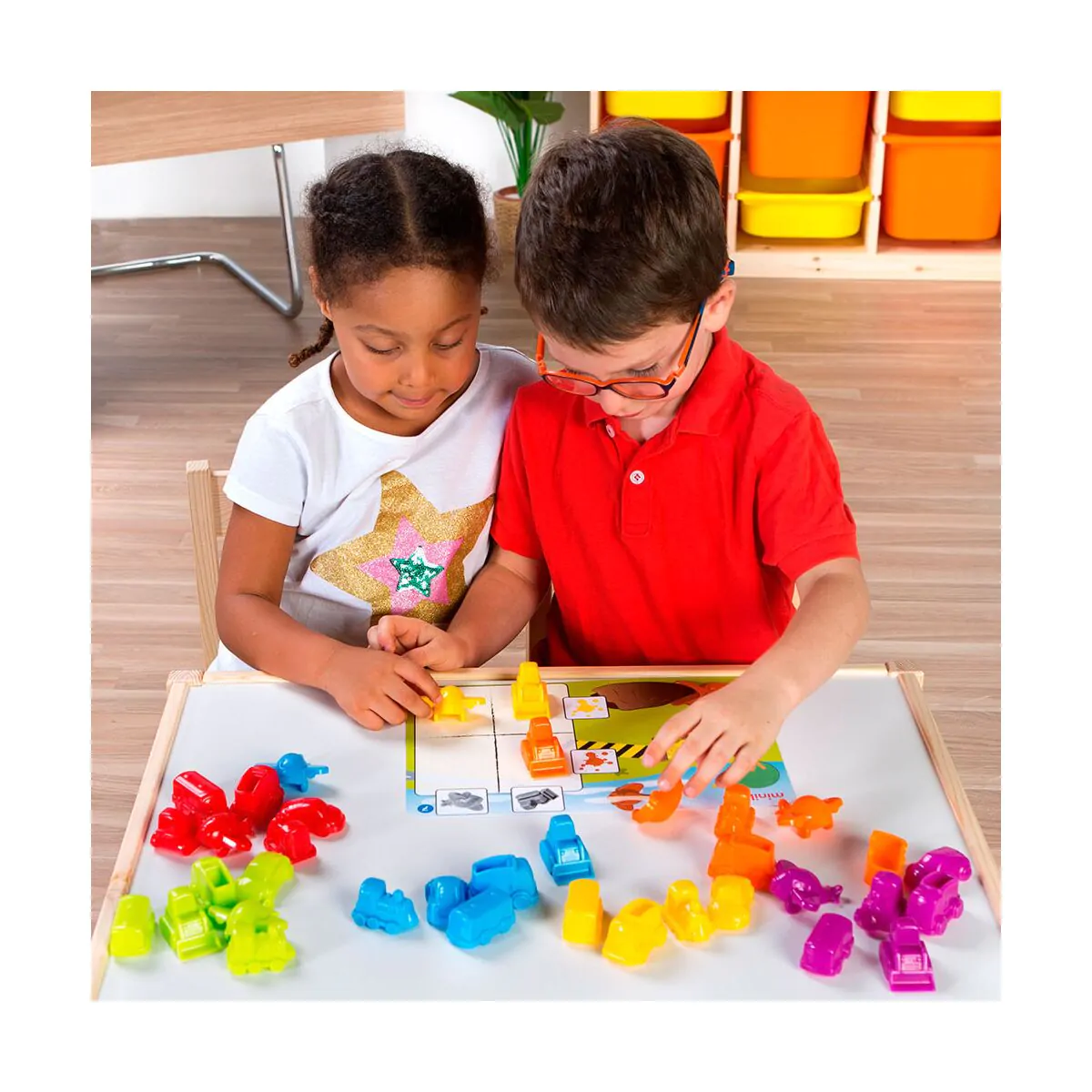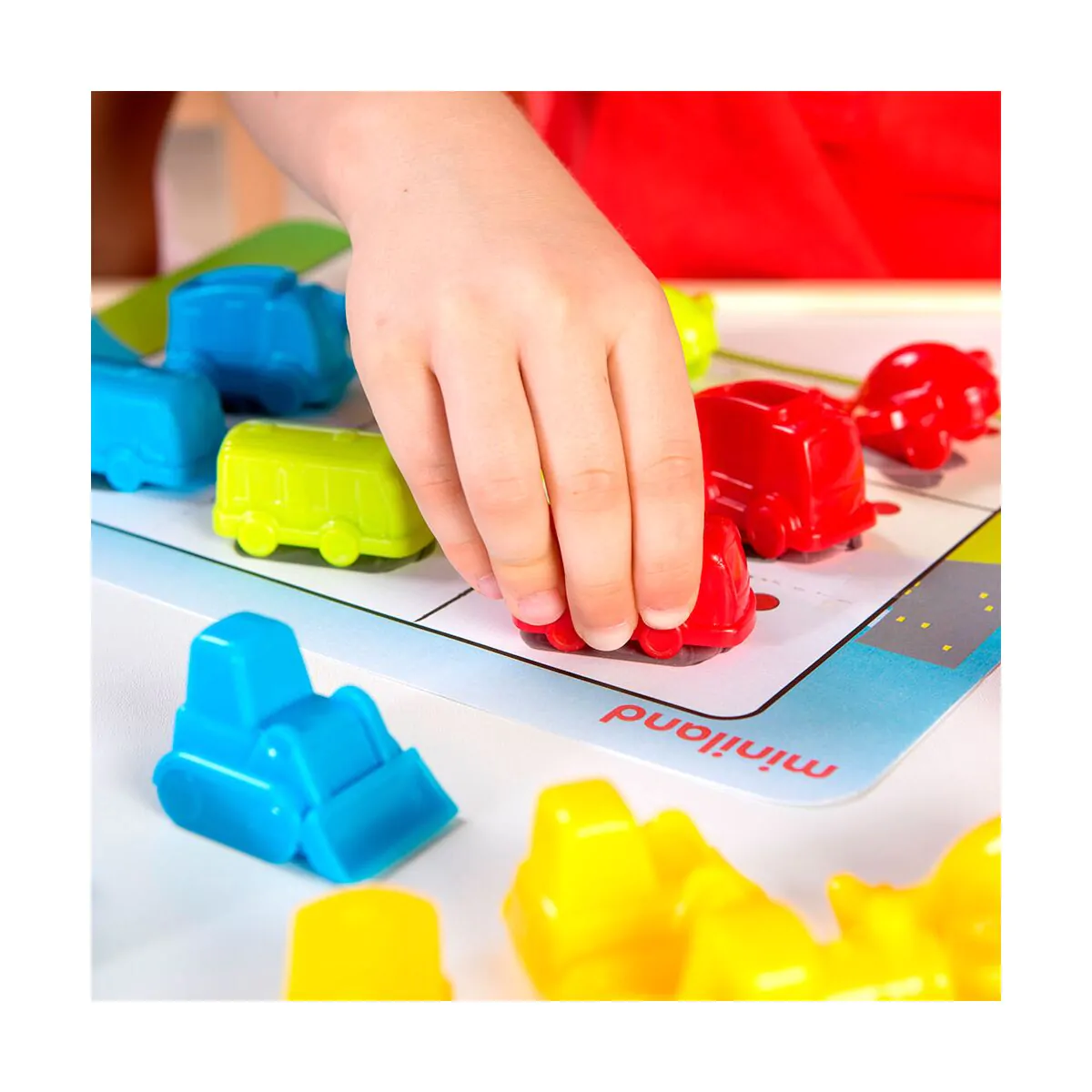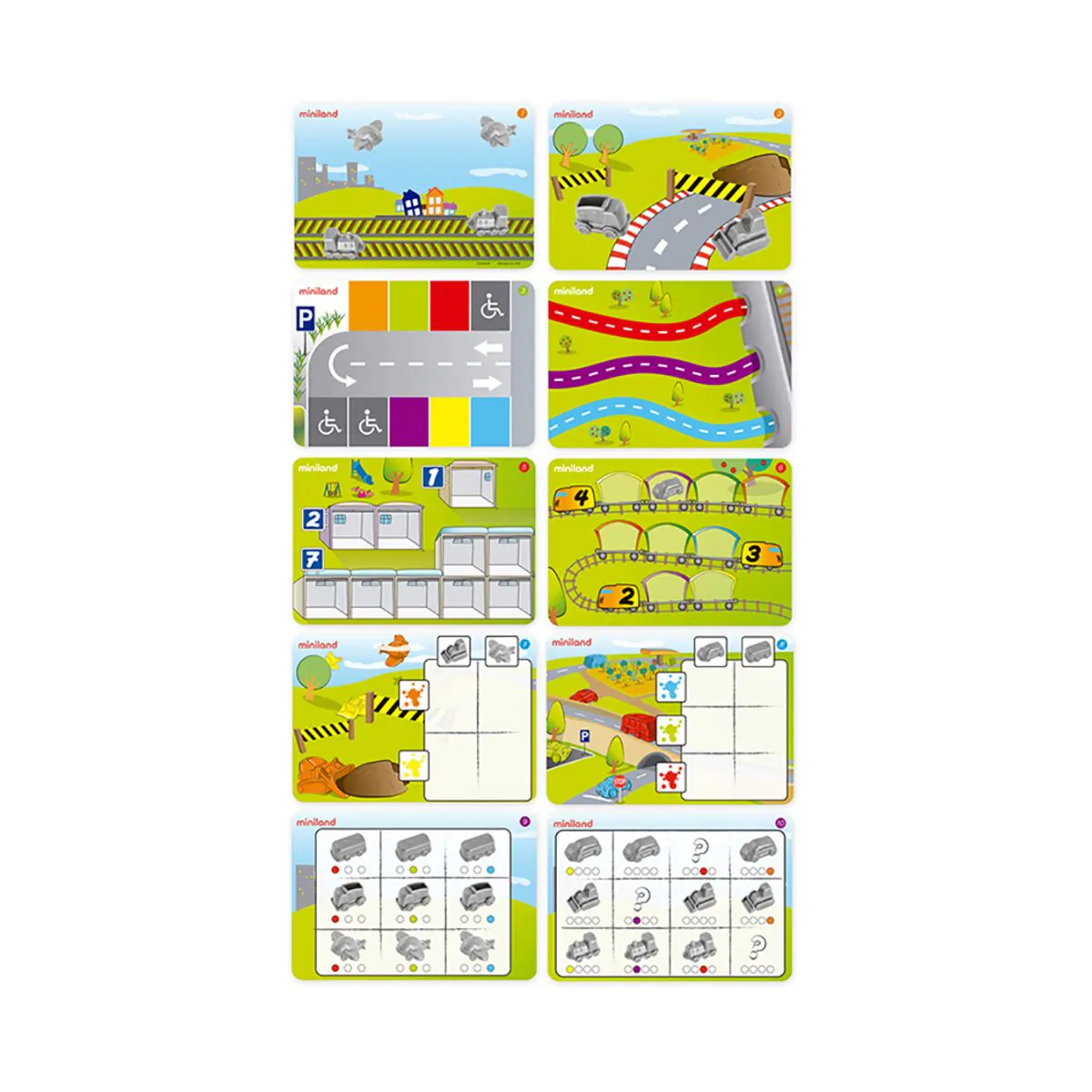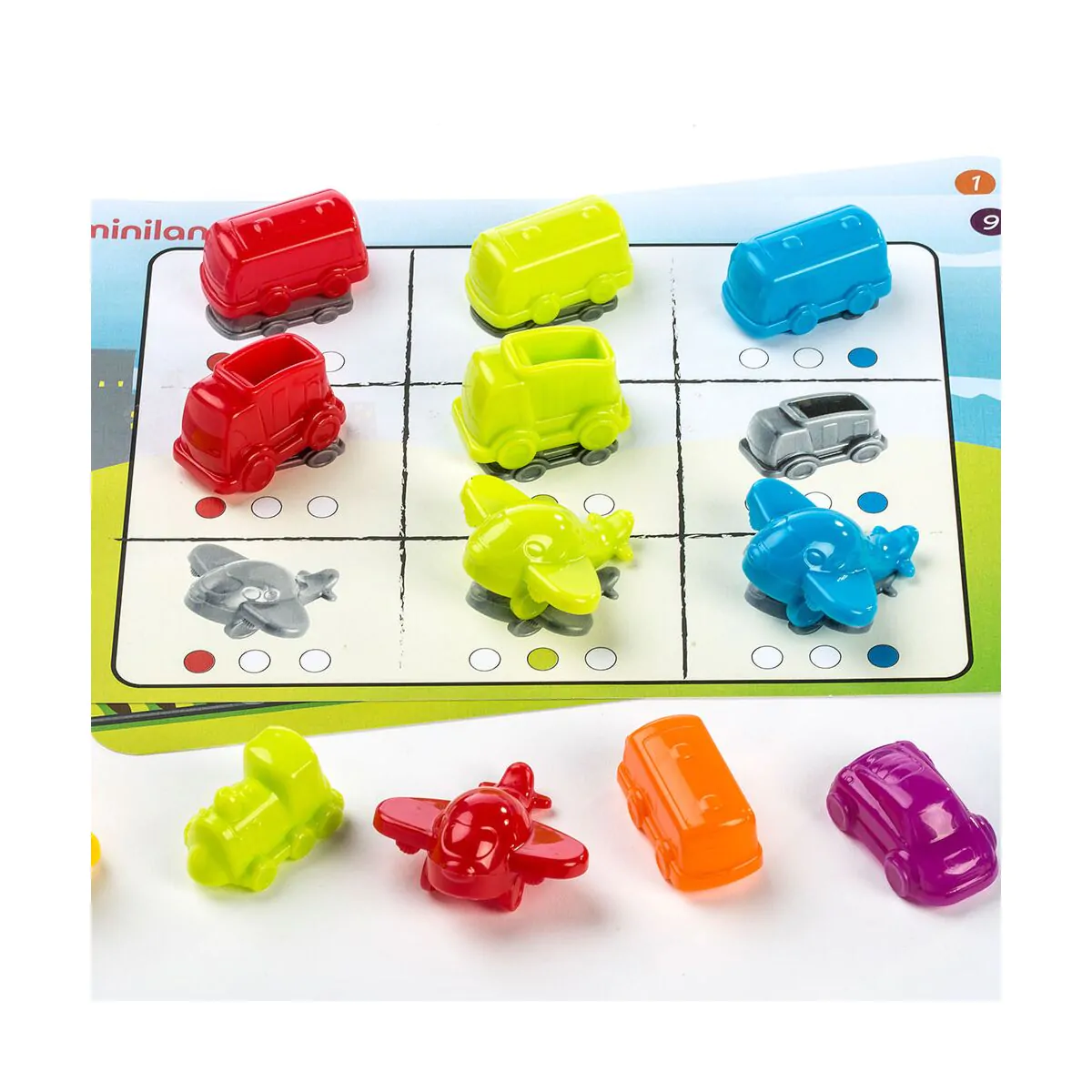 Atractivo juego de vehículos, ideal para familiarizarse a través de la manipulación y el juego, con las primeras nociones de la lógica matemática.