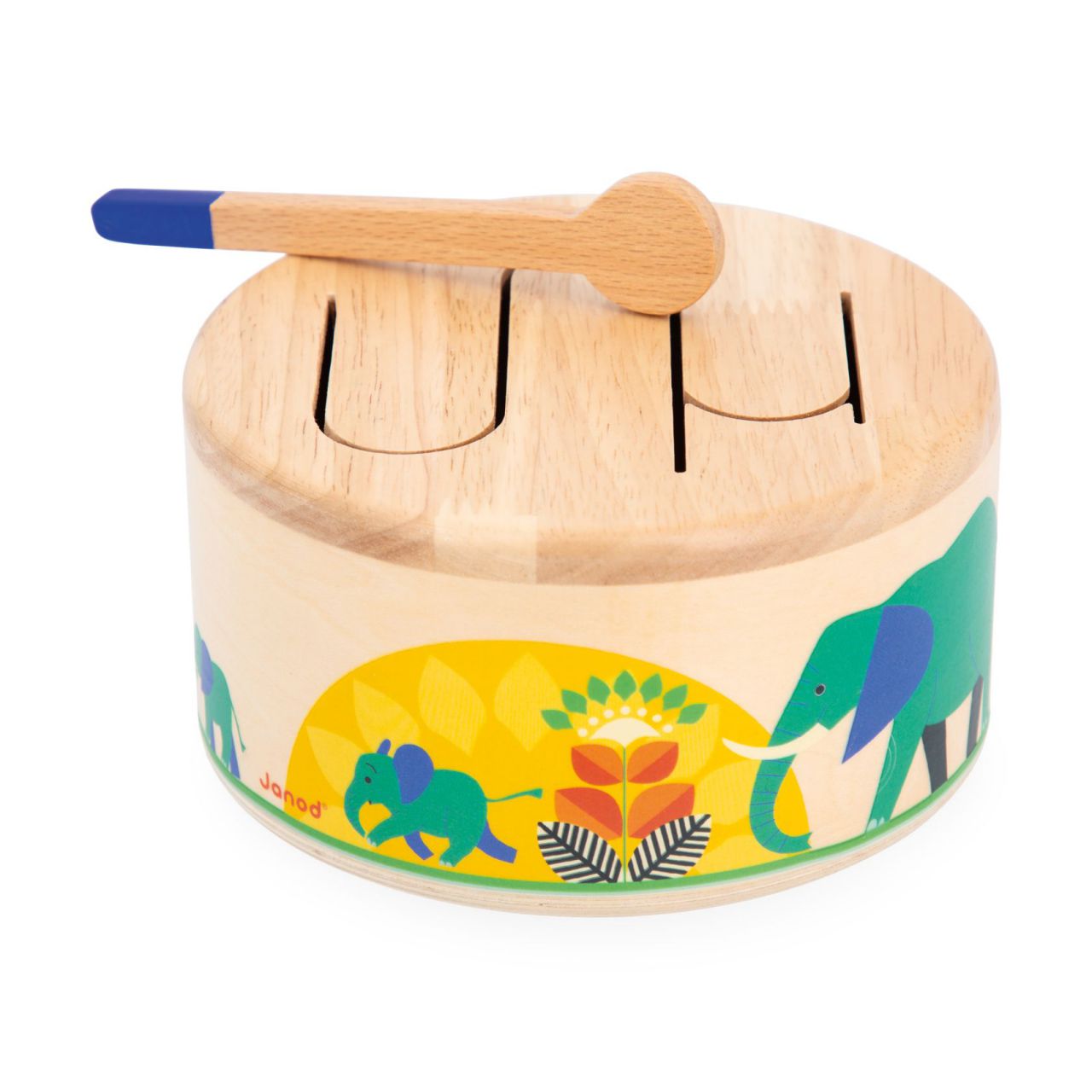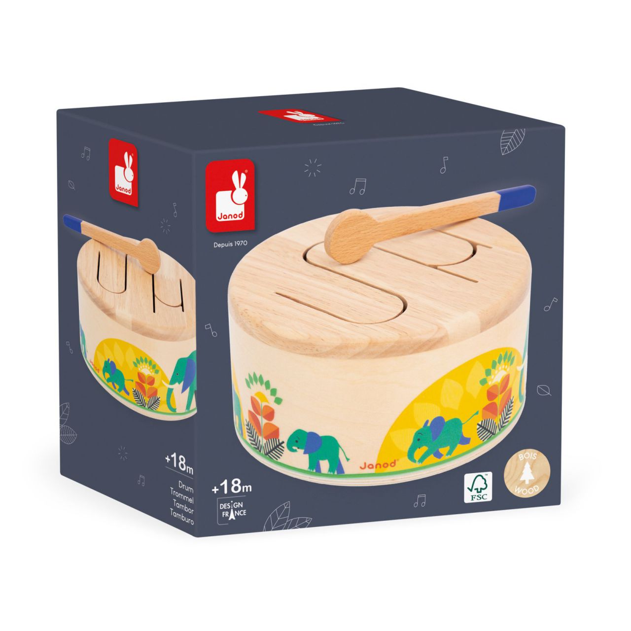 ¡Tam, tam, tam! Este tambor de madera permitirá a su hijo desarrollar su sentido del ritmo y su coordinación mano-ojo gracias a la baqueta de madera incluida. Redondo y fácil de transportar, este juguete de imitación resuena cuando el niño golpea sobre él. Su patrón en forma de onda permite la resonancia de diferentes sonidos, ideales para iniciar a los niños en los ritmos y los sonidos. Juguete de estimulación musical para niños a partir de 18 meses. Juguete de madera FSC.
