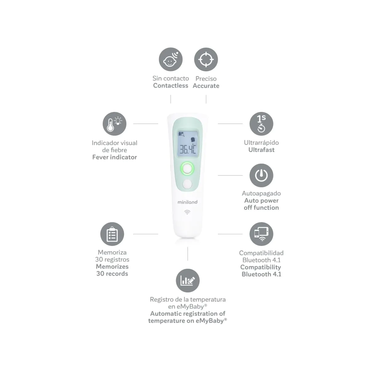 Medición rápida, precisa y sin contacto. thermoadvanced pharma mide la temperatura de tu bebé en la frente y en tan solo 1 segundo sin necesidad de contacto. Puede también medir la temperatura del agua del baño, de los alimentos (biberones y papillas) y la ambiente. Además de guardar las últimas 30 mediciones en el propio termómetro, con la app eMyBaby podrás registrar todos los resultados también en la aplicación para realizar su seguimiento.