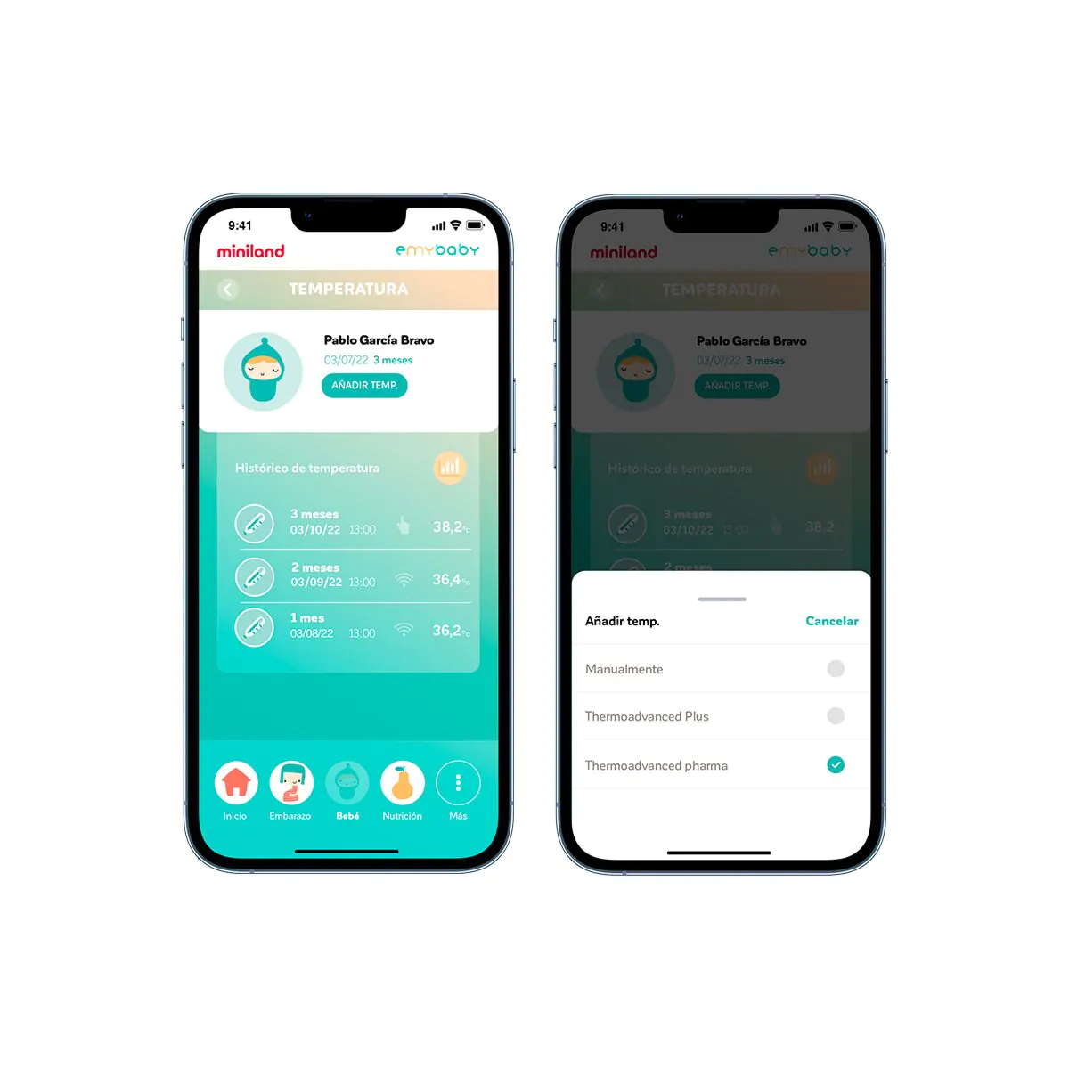 Registra la temperatura a través de eMyBaby®: A través de la aplicación eMyBaby, thermoadvanced pharma se comunica con el smartphone y la Tablet para registrar las temperaturas tomadas, pudiendo llevar un seguimiento de las mismas en cualquier momento y lugar. Es posible utilizar el termómetro de forma aislada o con eMyBaby®.
