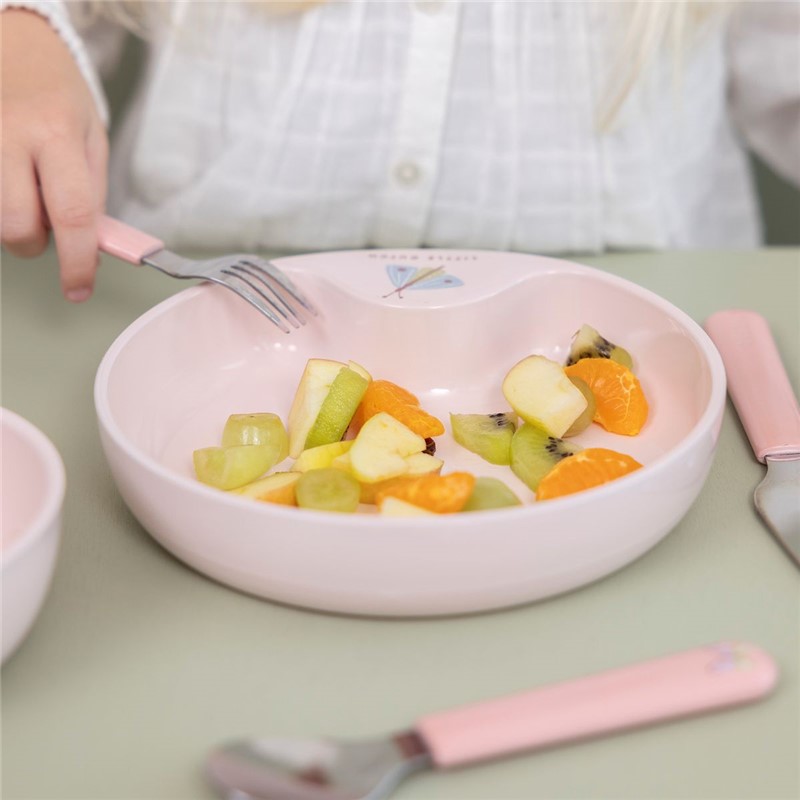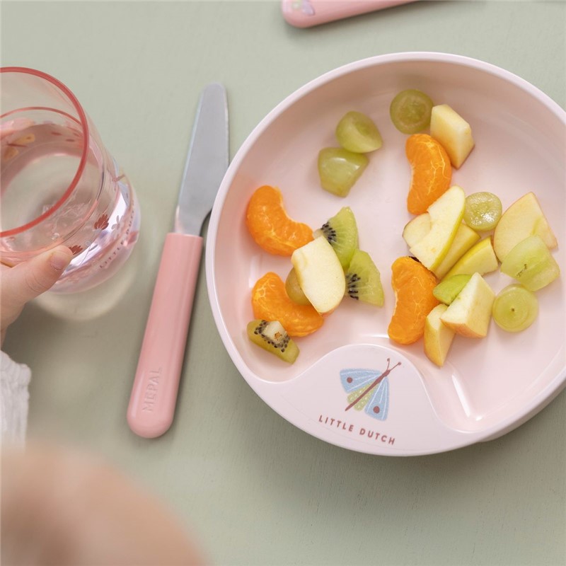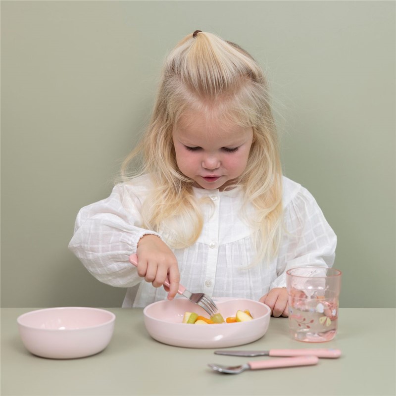 Vajilla infantil de 6 piezas de la colección Mio de Mepal para Little Dutch. Esta bonita vajilla además de tener un bonito diseño es perfecta para ser la primera vajilla del peque. Consta de 6 piezas: un plato, un vaso, 3 cubiertos de acero inoxidable y un bol. El plato y el bol son aptos para usar en el microondas. Libre de BPA