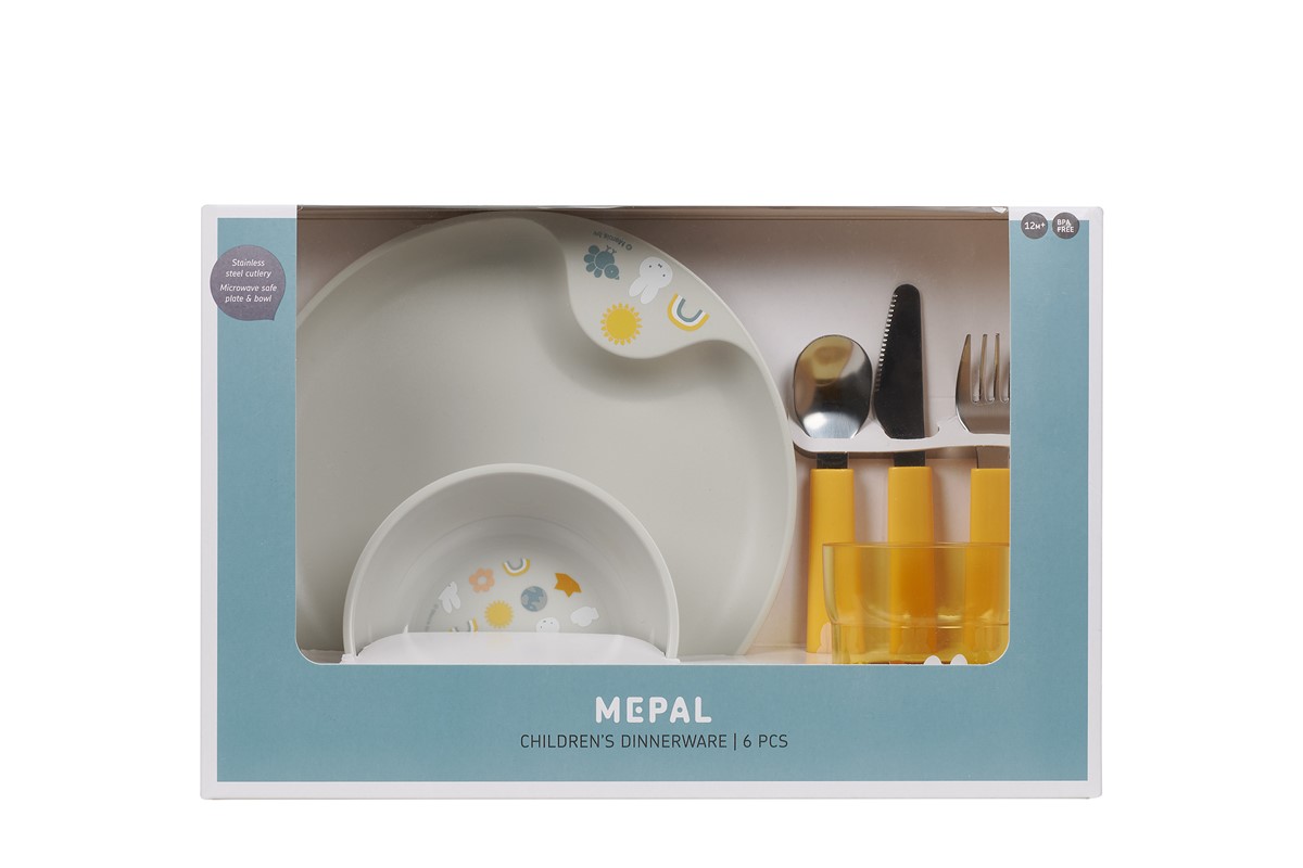Vajilla infantil de 6 piezas de la colección Mio de Mepal para Little Dutch. Esta bonita vajilla además de tener un bonito diseño es perfecta para ser la primera vajilla del peque. Consta de 6 piezas: un plato, un vaso, 3 cubiertos de acero inoxidable y un bol. El plato y el bol son aptos para usar en el microondas. Libre de BPA