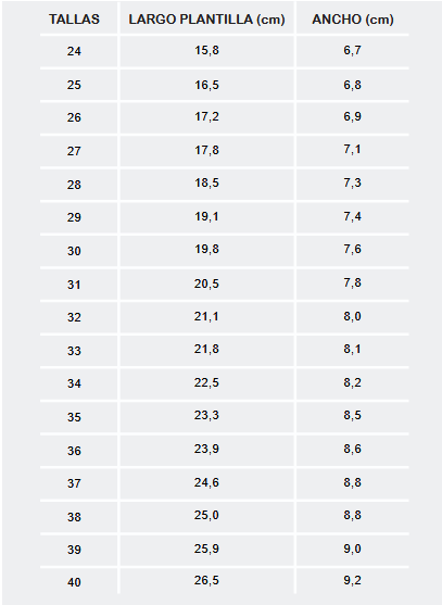 ¿QUE TALLA NECESITO? Para elegir la talla más adecuada, siempre recomendamos añadir un mínimo de 0’8 cm y un máximo de 1’2 cm extra a la medida del largo del pie. Y recuerda, ¡en sandalias siempre un poquito menos! En las imágenes de cada modelo podrás encontrar su guía de tallas.